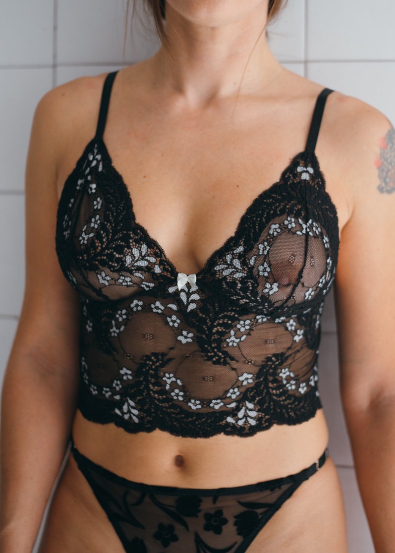 Delicate and versatile, this sheer lace bralette doubles as lingerie or a sheer tank top. Crafted from reclaimed deadstock lace, each bralette is slightly different and can not be reproduced. Please keep in mind, the lace pattern on this top is asymmetrical… see photos for details.