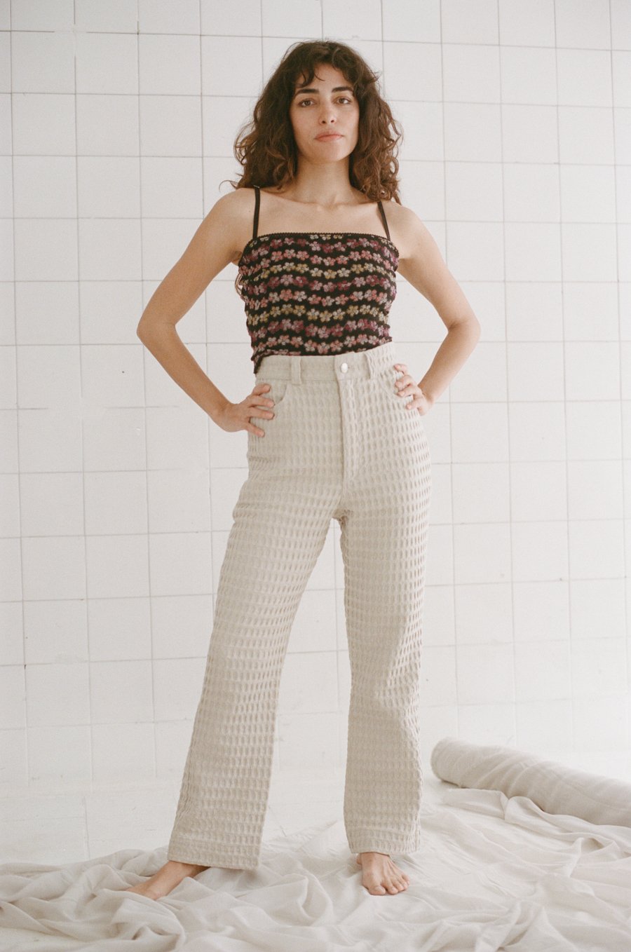 High-waisted waffle trousers with a straight leg, back pockets, belt loops, metal zip, and vintage button closure.
