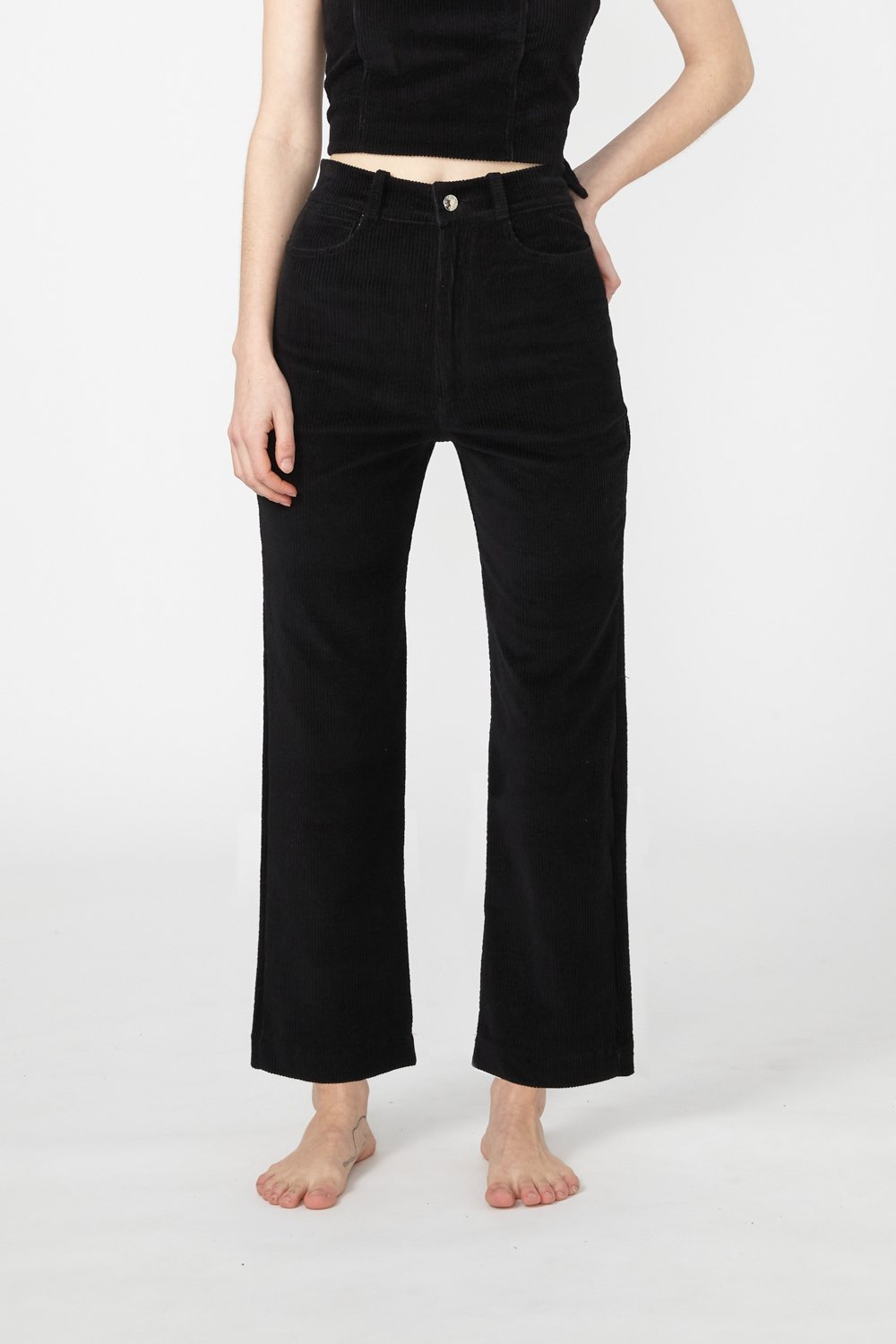 High-waisted workwear trousers made from cotton stretch corduroy with back pockets, belt loops, hammer loop, metal zip and vintage button closure.