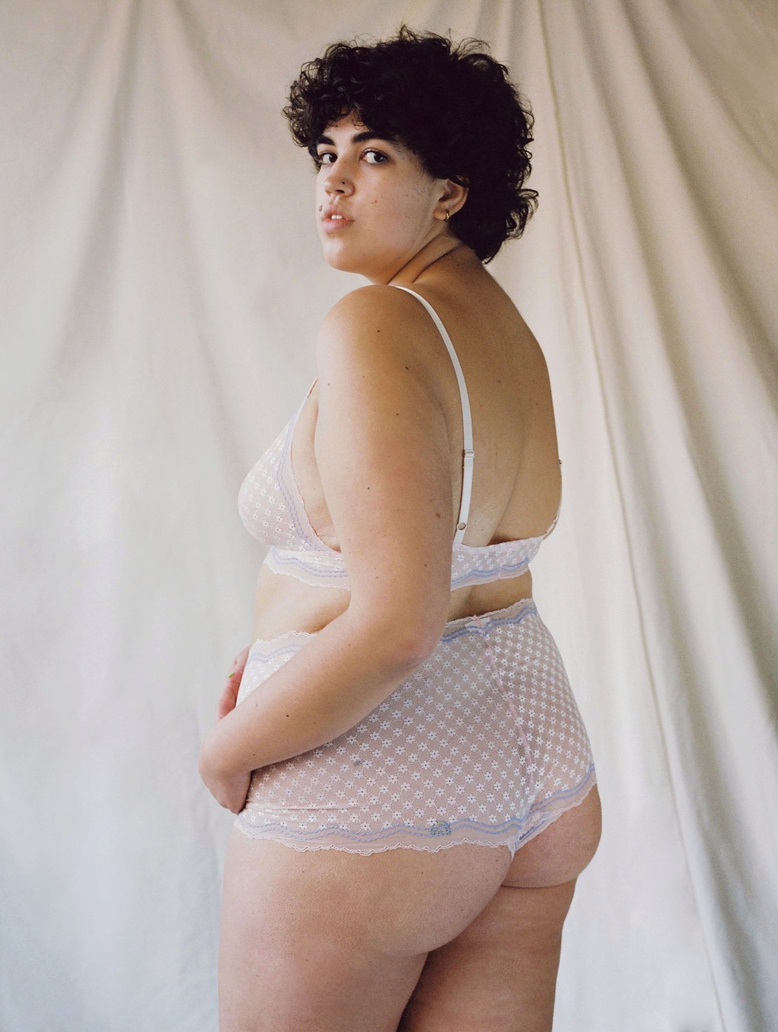 Our classic high waisted lace knickers. The Mallow Knickers are made from light pink and powder blue deadstock lace.